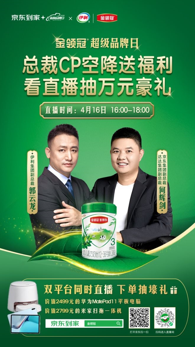 4月16日,京東到家攜手伊利金領(lǐng)冠打造的超級(jí)品牌日也將開啟“直播購物1小時(shí)達(dá)”,伊利集團(tuán)副總裁郭云龍和達(dá)達(dá)集團(tuán)副總裁、京東集團(tuán)副總裁何輝劍受邀組成總裁CP做客京東到家直播間,聯(lián)手為消費(fèi)者發(fā)放福利。該場直播將在京東到家和小時(shí)購雙渠道同時(shí)進(jìn)行。