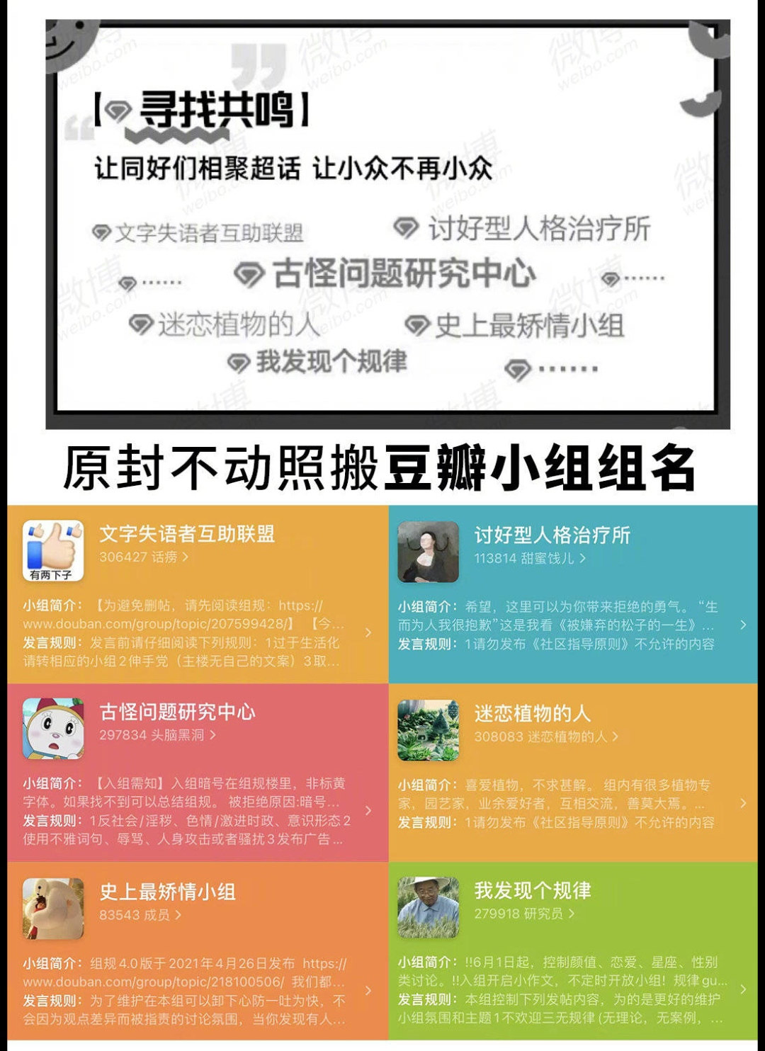 “微博不是第一個(gè)來挖墻腳的平臺,其他平臺挖大組組長的事早就有了,從去年清朗行動(dòng)開始,豆瓣小組就進(jìn)行了多次整改,而每逢整改,愛聊的豆友討論下一處搬到哪個(gè)平臺的同時(shí),或多或少伴都會(huì)隨其他平臺來挖組長的消息。但微博這個(gè)‘超話新星計(jì)劃’屬實(shí)太明目張膽了!