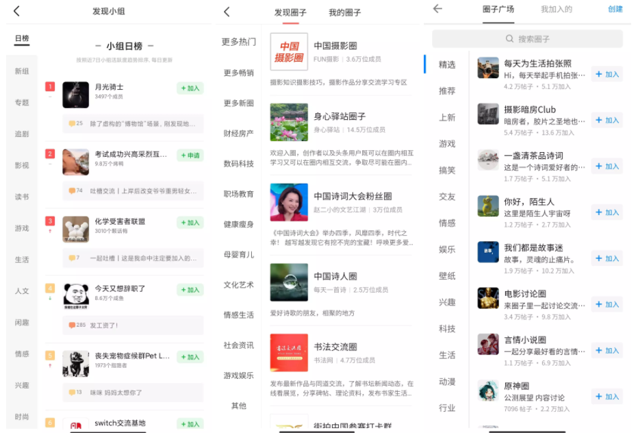 圖/分別為豆瓣、今日頭條、知乎的小組/圈子界面 來源/燃財(cái)經(jīng)截圖