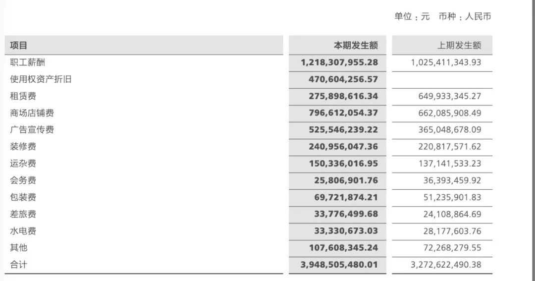 財(cái)報(bào)顯示,銷售費(fèi)用組成中,僅商場(chǎng)店鋪費(fèi)近8億元,同比增長(zhǎng)20%。廣告宣傳費(fèi)超5億元,同比增長(zhǎng)44%;其余水電費(fèi)開支同比增長(zhǎng)17%。
