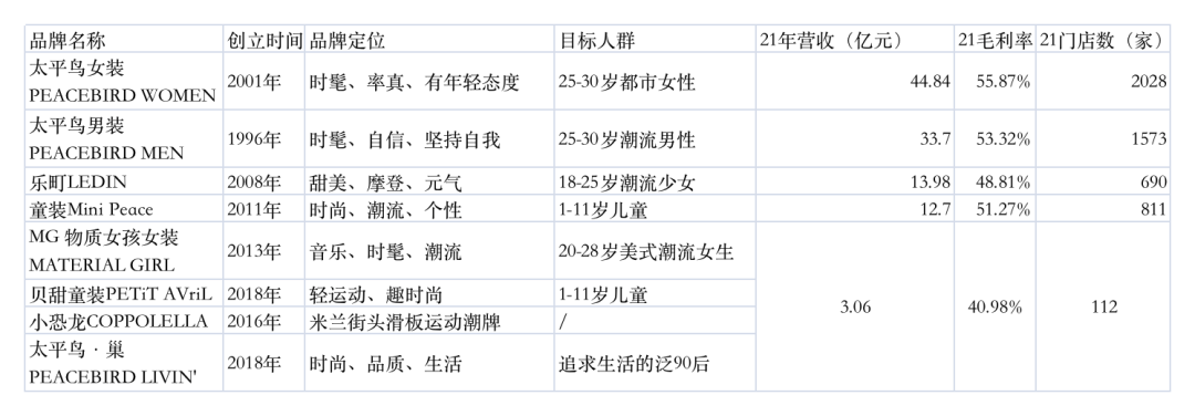 目前,太平鳥旗下共包括主力品牌(太平鳥男裝PEACEBIRD MEN、太平鳥女裝PEACEBIRD WOMEN、樂町LEDIN、童裝Mini Peace)、新興品牌(MG 物質(zhì)女孩女裝MATERIAL GIRL、貝甜童裝PETiT AVriL、小恐龍COPPOLELLA)以及生活家居(太平鳥·巢PEACEBIRD LIVIN')。