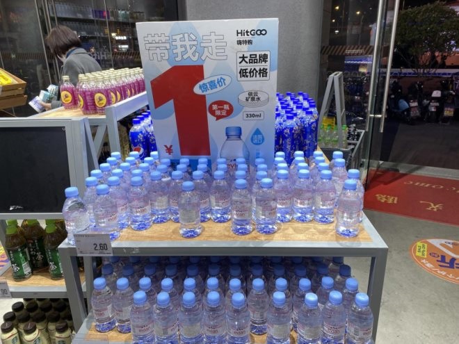 當(dāng)然,從價(jià)格上來看,3.6元相對于線下傳統(tǒng)商超和天貓渠道的5.3元來說的確要便宜不少。值得一提的是,諸如星巴克、元?dú)馍、百事等頭部品牌均擺放在店內(nèi)醒目位置,1元1瓶的依云礦泉水更是直接擺放在內(nèi)店門口旁。而這些品牌的折扣相對于其他不那么知名的二三線產(chǎn)品來說也要低上不少。