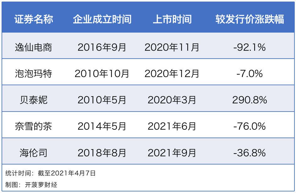 時機(jī)選得好,上市速度也快,最年輕的海倫司從成立到登陸港交所用了不到3年。不過,上市快不等于表現(xiàn)穩(wěn),五只“第一股”里最穩(wěn)的貝泰妮,股價走勢一路向下,另外四只更是跌破發(fā)行價。其中逸仙電商作為美妝賽道的明星公司,上市首日股價大漲75%,后續(xù)受中概股集體殺跌的影響,股價如今跌到1美元以下。