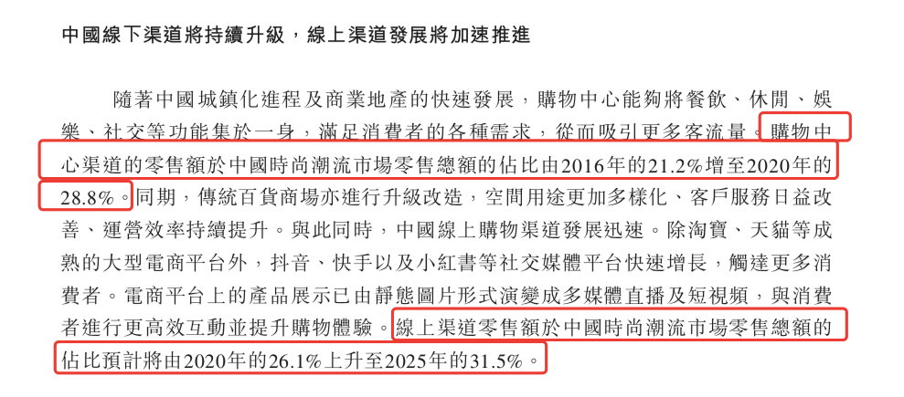 百麗招股書所援引的弗若斯特沙利文報(bào)告顯示,2016年與2020年相比,中國時(shí)尚潮流市場中,百貨渠道的收入占比從28%降至19%。購物中心和線上渠道的收入規(guī)模則在不斷擴(kuò)大。購物中心渠道產(chǎn)生的零售額占比從2016年的21.2%上升到2020年的28.8%。