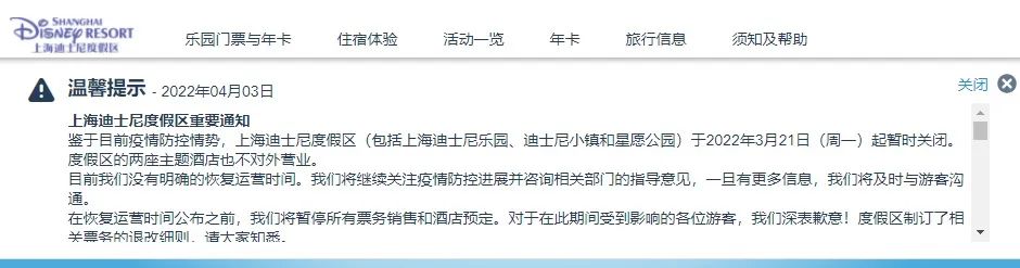2022年正在成為主題樂園的一個重要發(fā)展“關(guān)口”:開年后不久,天津海昌極地海洋樂園就發(fā)布了暫時閉園通知;緊接著,香港迪士尼樂園在其官網(wǎng)放出消息,其暫時關(guān)閉至4月20日;然后包括上海迪士尼樂園、迪士尼小鎮(zhèn)和星愿樂園在內(nèi)的上海迪士尼度假區(qū)也發(fā)布閉園公告,稱此次閉園預(yù)計持續(xù)較長時間。