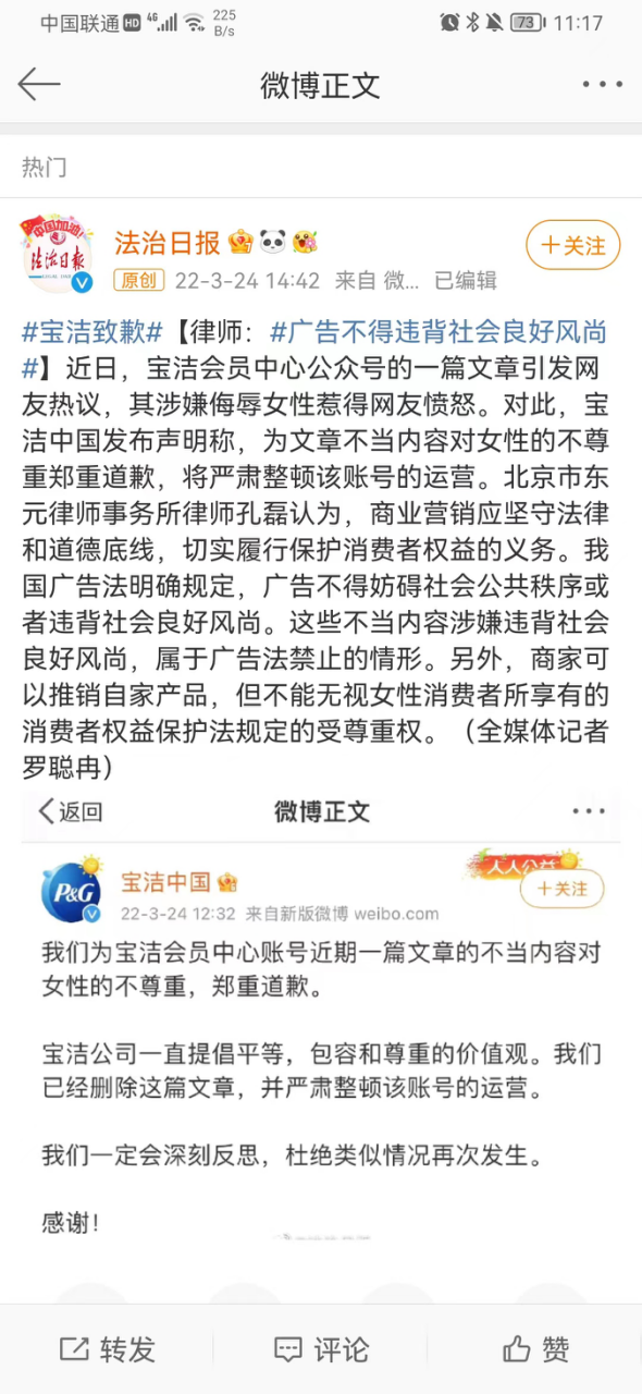 雖然,上述文章已被刪除,但此事依舊在社交平臺(tái)上引發(fā)了廣泛的討論,3月24日,#寶潔#等相關(guān)話(huà)題也一度沖上微博熱搜第四名。不少網(wǎng)友認(rèn)為,寶潔的文章有侮辱女性和性別歧視的嫌疑。隨后,寶潔中國(guó)在官方微博發(fā)布了道歉聲明(詳見(jiàn)《寶潔道歉!》)。