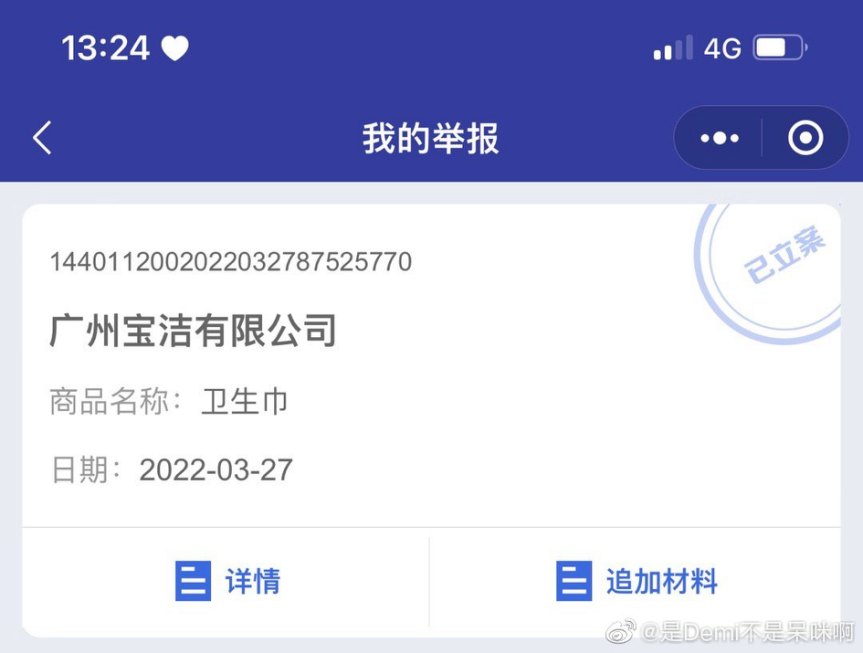值得一提的是,青眼還發(fā)現(xiàn),4月7日11時(shí)許,微博賬號(hào)“是Demi不是呆咪啊”不僅轉(zhuǎn)發(fā)了上述“鄧高靜律師”發(fā)布的寶潔被立案調(diào)查的微博信息,其還表示,“我也收到了立案消息”。根據(jù)該微博賬號(hào)發(fā)布的圖片顯示,其舉報(bào)的也是廣州寶潔有限公司,商品名稱(chēng)為“衛(wèi)生巾”,立案日期為2022年3月27日。