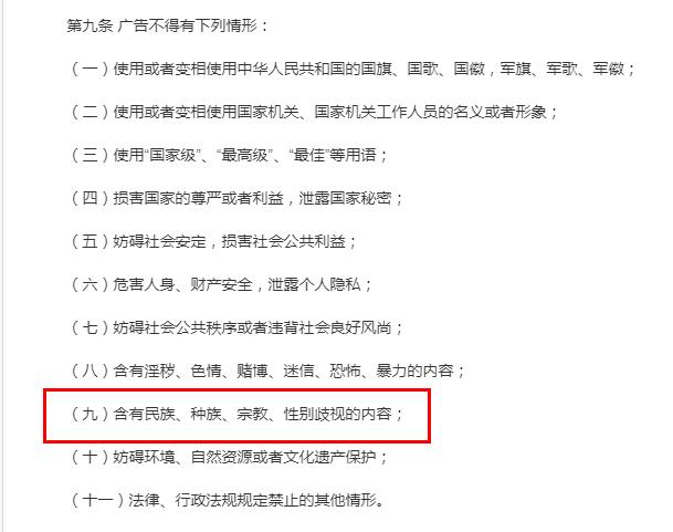 根據(jù)《廣告法》第九條規(guī)定,“廣告不得含有民族、種族、宗教、性別歧視的內(nèi)容”,違反本規(guī)定,可依據(jù)《廣告法》第五十七條,處二十萬(wàn)元以上一百萬(wàn)元以下的罰款,情節(jié)嚴(yán)重的并可以吊銷(xiāo)營(yíng)業(yè)執(zhí)照,撤銷(xiāo)其廣告審批文件、一年內(nèi)不受理其廣告審查申請(qǐng)。