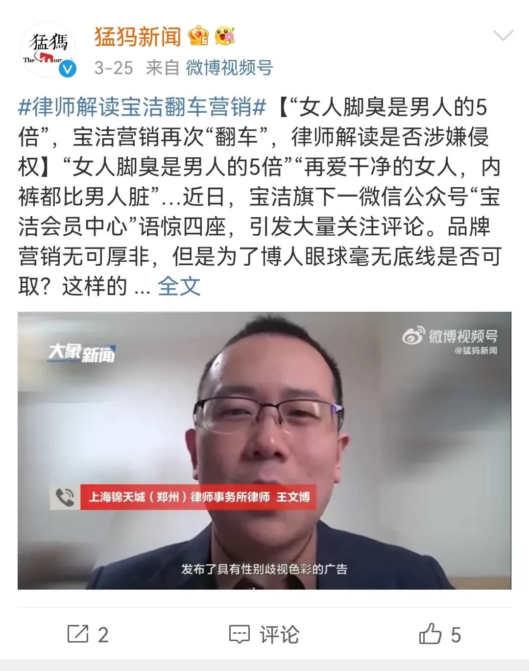 另?yè)?jù)東方今報(bào)官方微博“猛犸新聞”發(fā)布的視頻顯示,上海錦天城(鄭州)律師事務(wù)所律師王文博稱(chēng),“寶潔該文章中發(fā)布了具有性別歧視色彩的廣告,違反了廣告法第九條的規(guī)定;另外該文章中使用了‘5倍’‘2300%’‘100萬(wàn)個(gè)病毒和10萬(wàn)個(gè)細(xì)菌’等數(shù)據(jù),寶潔不但要對(duì)數(shù)據(jù)的準(zhǔn)確性負(fù)責(zé),還應(yīng)該按照《廣告法》第十一條的規(guī)定標(biāo)明出處!蓖跷牟┍硎荆叭绻@些數(shù)據(jù)是假的,那么,寶潔還可能涉嫌發(fā)布虛假?gòu)V告。”