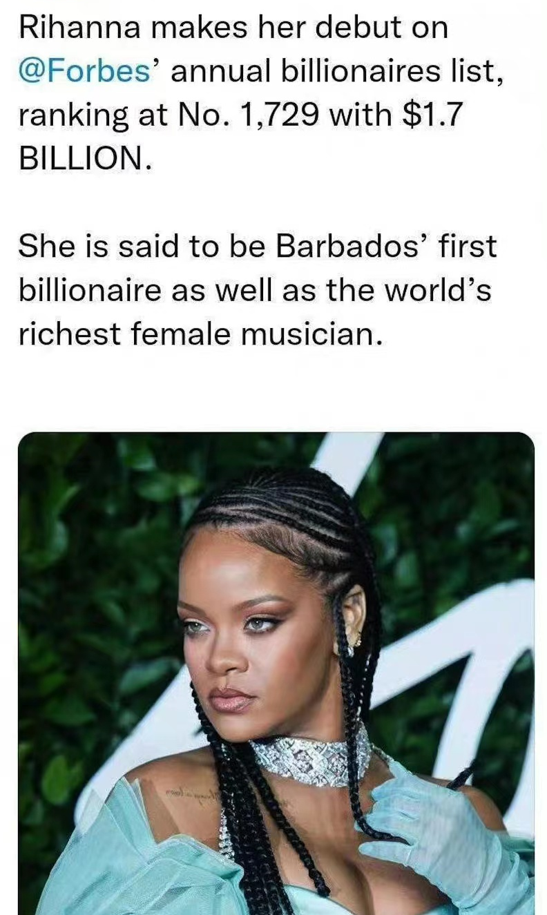 4月5日,福布斯公布了2022年全球億萬(wàn)富豪榜,蕾哈娜憑借17億美元資產(chǎn)首次上榜,排名第1729。