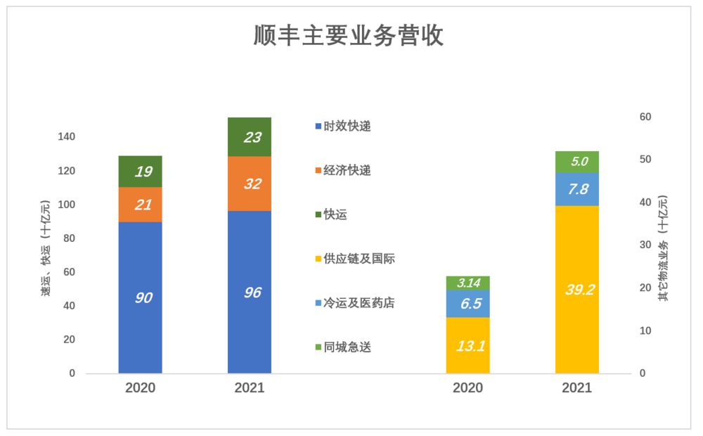 2021年報(bào)將物流業(yè)務(wù)分為時(shí)效快遞、經(jīng)濟(jì)快遞、快運(yùn)、冷運(yùn)及醫(yī)藥、同城急送、供應(yīng)鏈及國(guó)際六大部分: