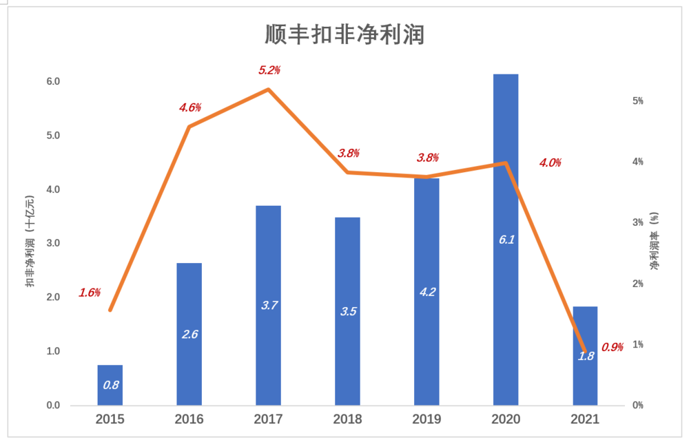 2021財(cái)年,順豐扣非凈利潤(rùn)18.3億,同比下降70%。