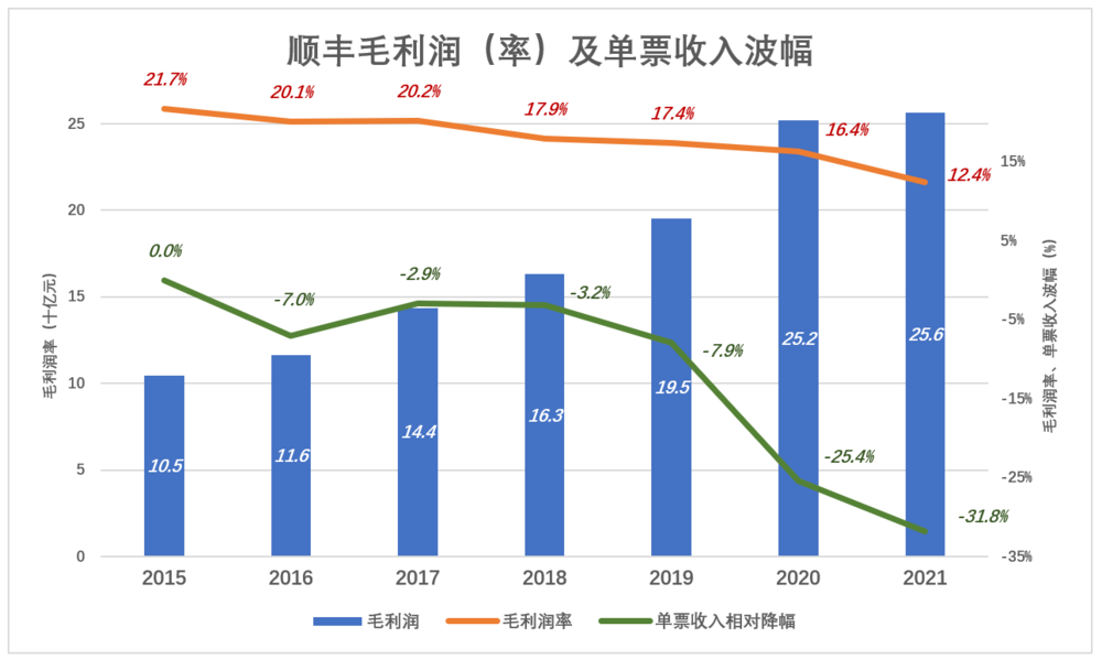 2020年單票平均收入17.8元/件,較2015年下降25.4%。但順豐毛利潤(rùn)不僅沒有變?yōu)樨?fù)值,還創(chuàng)紀(jì)錄地達(dá)到252億,毛利潤(rùn)率16.4%。