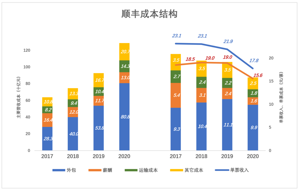 想知道順豐是怎么做到的,可將三大主要成本——外包、薪酬及運(yùn)輸,分?jǐn)偟矫繂螛I(yè)務(wù)進(jìn)行觀察: