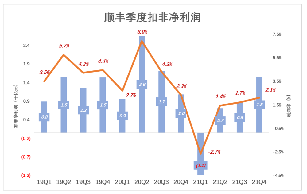 2021年順豐業(yè)績(jī)呈前低后高:Q1虧損11.3億、Q2扭虧、Q4扣非凈利潤(rùn)15億。說明順豐的至暗時(shí)刻已然過去。
