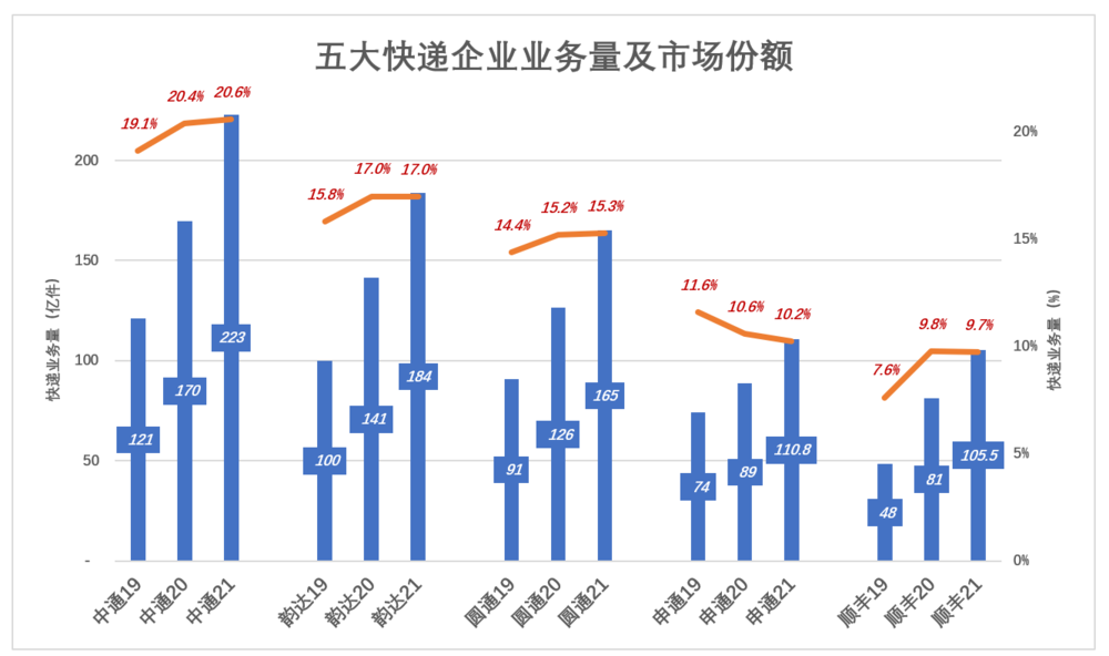 2021年,中國(guó)快遞業(yè)務(wù)量達(dá)1083億件(2018年突破500億件)。五大快遞業(yè)務(wù)同比增長(zhǎng)、各自的市場(chǎng)份額幾乎沒有變化。