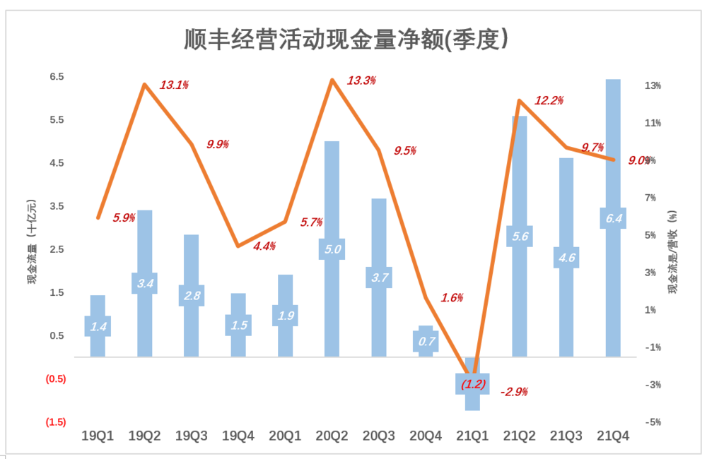 2021年Q1,經(jīng)營(yíng)現(xiàn)金流罕見地出現(xiàn)負(fù)值,但Q2、Q3都為正值且高于2020年同期的數(shù)值。Q4照例是低谷,但2021年Q4順豐經(jīng)營(yíng)活動(dòng)卻獲得64.2億凈流出,比2020年Q4多57億,把Q1流出的加倍收了回來。#耐人尋味#