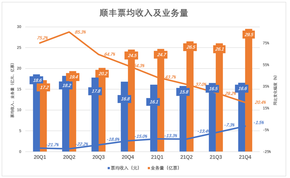 順豐曾被好事者稱為“快遞茅”,2020年扣非凈利潤(rùn)61.3億。2021年,順豐正式開戶“以價(jià)換量”戰(zhàn)略,Q1、Q2票均收入分別為18.6元/件、18.2元/件,同比降幅超過20%。降價(jià)的效果立竿見影,Q1、Q2業(yè)務(wù)量為17.2億票、19.4億票,同比幅分別為75.2%、85.3%。