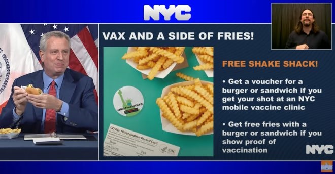 疫情期間,紐約市長白思豪為了呼吁市民接種疫苗,拿出Shake Shack招牌菜作餌,接種了的進店消費送Shake Shack招牌薯條,沒接種但前往移動巴士接種疫苗的,送一張ShackBurger兌換券。過去是食客稱Shake Shack為紐約味道,這次則是官方蓋章其“紐約市堡”的地位。