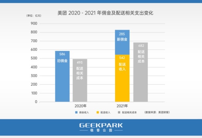 經(jīng)極客公園按照之前的定義計(jì)算,2020 年餐飲外賣(mài)傭金收入 586 億元,交易筆數(shù) 101 億筆,商戶(hù)每單向平臺(tái)平均支出 5.8 元;2021 年餐飲外賣(mài)傭金收入 285 億元,配送服務(wù)收入 542 億元,共計(jì) 827 億元,交易筆數(shù) 144 億筆,商戶(hù)每單向平臺(tái)平均支出 5.7 元,每筆有 0.1 元的微弱下降,相當(dāng)于在增長(zhǎng)中讓出了 14.4 億的收益。