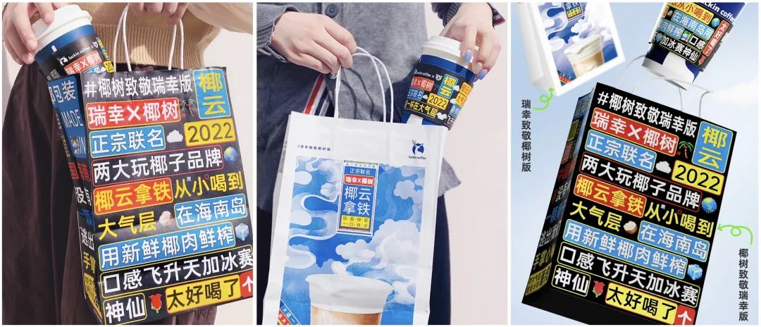 4月11日,瑞幸與椰樹(shù)聯(lián)名的“椰云拿鐵”正式上市。這款新品采用瑞幸的“椰云工藝”,用椰漿代替常規(guī)奶蓋,號(hào)稱(chēng)“輕盈綿密”和“一口吞云”。瑞幸還沿襲椰樹(shù)椰汁的包裝風(fēng)格,為這款新品設(shè)計(jì)了定制杯套和袋子。