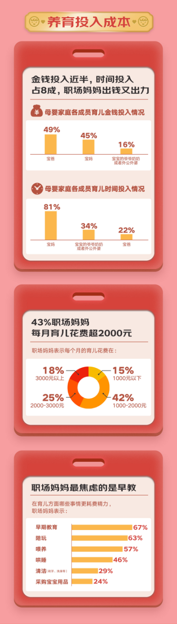 職場媽媽在育兒的付出上要更多。報告顯示,時間投入上占到休息時間的81%。在金錢投入上占到收入的45%,與寶爸們平分秋色。