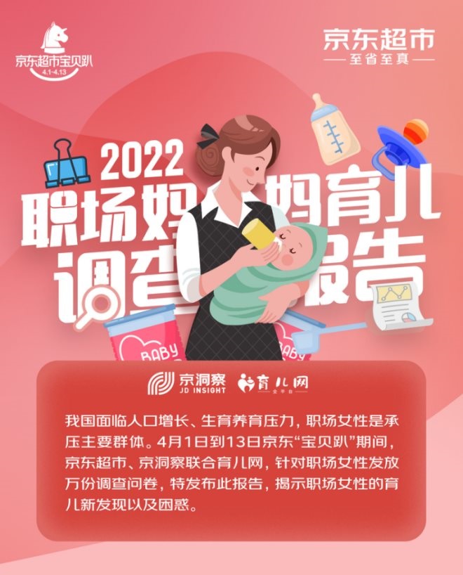 4月1日至13日京東“寶貝趴”期間,京東超市、京洞察聯(lián)合育兒網(wǎng),針對職場女性發(fā)放萬份調(diào)查問卷,并發(fā)布《2022職場媽媽育兒調(diào)查報告》(以下簡稱《報告》),揭示職場女性在育兒方面的新變化以及遭遇的困惑。