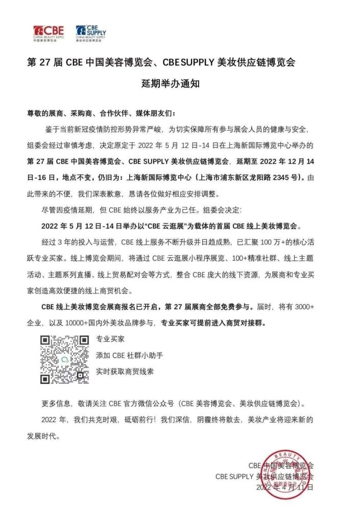 通知指出:鑒于當(dāng)前新冠疫情防控形勢(shì)異常嚴(yán)峻,為切實(shí)保障所有參與展會(huì)人員的健康與安全,組委會(huì)經(jīng)過審慎考慮,決定原定于2022年5月12日-14日在上海新國際博覽中心舉辦的第27屆CBE中國美容博覽會(huì)、CBE SUPPLY美妝供應(yīng)鏈博覽會(huì),延期至2022年12月14日-16日,地點(diǎn)不變,仍舊為上海新國際博覽中心。