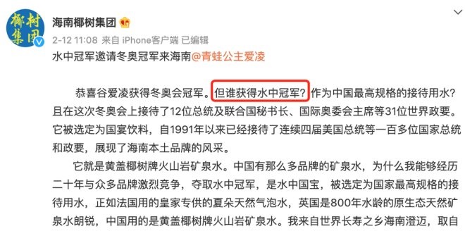 2月12日,谷愛(ài)凌獲得冬奧會(huì)首金后,椰樹(shù)集團(tuán)發(fā)文祝福,隨即話鋒一轉(zhuǎn),自問(wèn)自答“誰(shuí)是水中冠軍”,推廣黃蓋椰樹(shù)牌火山巖礦泉水。