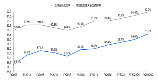 從2013年到2021年,全球整體會(huì)員續(xù)約率從86.3%提升至88.7%,在美國(guó)和加拿大的會(huì)員續(xù)訂率在90%的高基數(shù)下,依然提升到91.3%。截至2022年二季度,全球續(xù)訂率繼續(xù)上升至89.6%,美國(guó)和加拿大地區(qū)為92.0%。