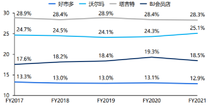 多年來(lái),Costco的費(fèi)用率基本在10%左右浮動(dòng),而對(duì)比同行,沃爾瑪20.7%,BJ批發(fā)俱樂(lè)部15%,塔吉特19.8%。