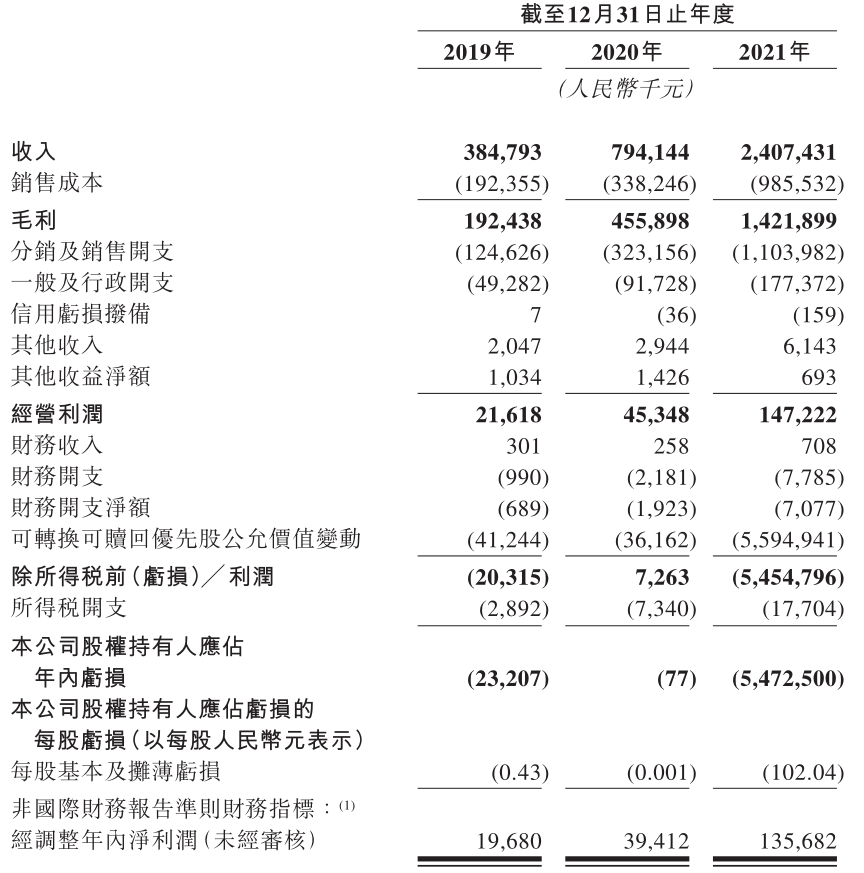 營(yíng)收方面,蕉下近三年的營(yíng)收一路高漲,從2019年的3.85億元,增長(zhǎng)到2020年的7.94億元, 2021年進(jìn)一步提升至24.07億元。2019年至2021年的經(jīng)調(diào)整年內(nèi)凈利潤(rùn),分別為1968萬(wàn)元、3941萬(wàn)元和1.36億元。