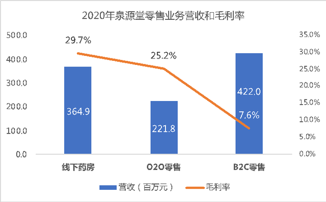 泉源堂定位全渠道藥房,主要有三個(gè)零售渠道:天貓京東等B2C電商平臺(tái)、美團(tuán)餓了么O2O平臺(tái)、線下門店(含DTP),總計(jì)毛利率僅20.8%,低于行業(yè)領(lǐng)頭羊。