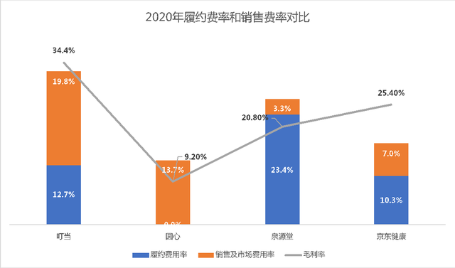 各家的履約和銷售費(fèi)率都不低,幾乎擠占了全部毛利。對(duì)比京東健康,除掉這兩費(fèi),毛利還有空間。