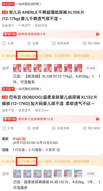 京東“寶貝趴”期間推出“尿褲尺碼隨心換”服務(wù),換貨周期長達(dá)90天,能更好地適應(yīng)寶寶的生長發(fā)育速度,減少囤貨過多、“屁糧”浪費現(xiàn)象。目前,目前,“尿褲尺碼隨心換”服務(wù)涵蓋超2900個單品,覆蓋京東超市紙尿褲品類七成品牌。