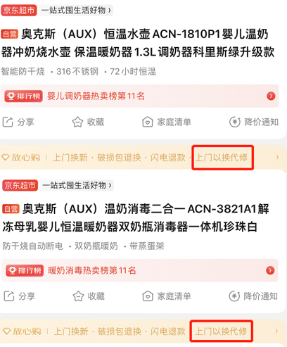 京東超市“喂養(yǎng)電器上門以換代修”服務(wù),對在保修期內(nèi)且符合免費維修范圍的產(chǎn)品,采取上門取件時直接更換商品做法,以“無縫”體驗解決喂養(yǎng)電器急用難題。
