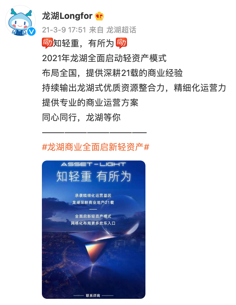 當(dāng)布局的速度與規(guī)模都上來(lái)之后,龍湖商業(yè)在2021年3月,以一張「知輕重、有所為」的海報(bào),宣布全面啟動(dòng)輕資產(chǎn)模式。