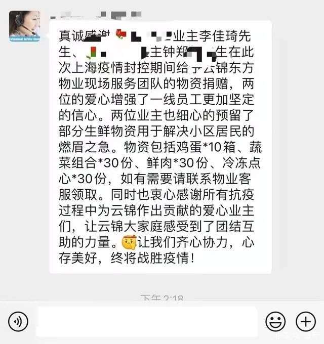 近期的另一張截圖則印證了這個傳言的真實性。網(wǎng)傳截圖中顯示,疑似云錦東方的客服人員在業(yè)主群中稱,“真誠感謝業(yè)主李佳琦先生在此次上海疫情封控期間,給予云錦東方物業(yè)現(xiàn)場服務(wù)團(tuán)隊的物資捐贈。物資包括雞蛋、蔬菜、鮮肉、點心等,如有需要可聯(lián)系物業(yè)客服領(lǐng)取!