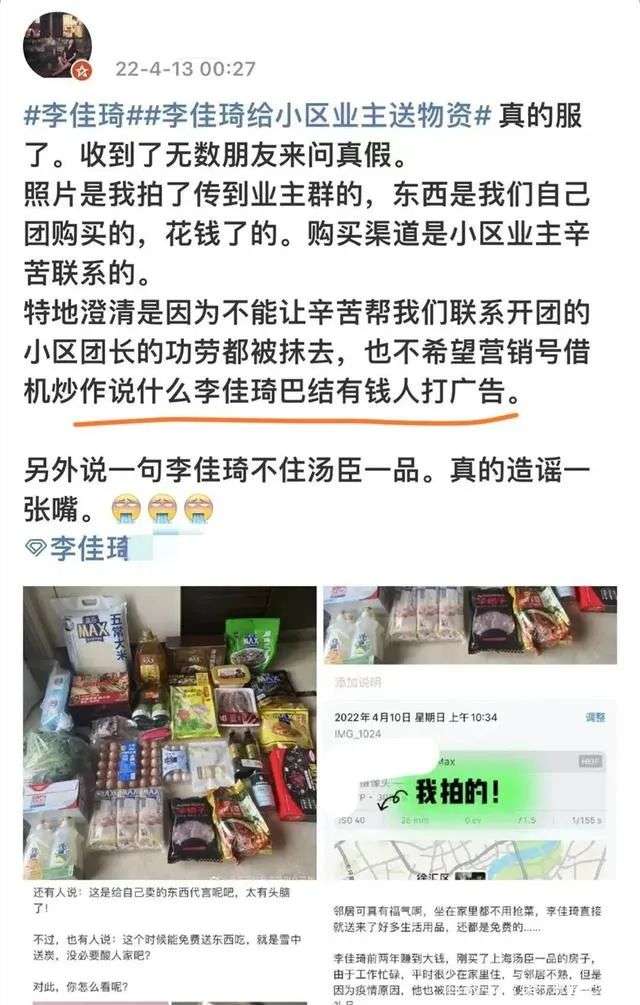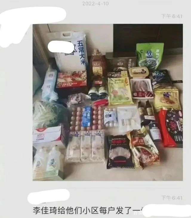 起因是有網(wǎng)友曬出一張截圖,圖中是擺了一地的大米、雞蛋、調(diào)味品等生活必需品,并稱“這是住在湯臣一品的李佳琦,給每戶鄰居都送的大禮包!