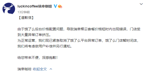 對此瑞幸咖啡官方微博發(fā)道歉信回應(yīng):由于餓了么后臺價格配置問題,導(dǎo)致瑞幸椰云套餐價格短時內(nèi)出現(xiàn)錯誤,門店受到大量異常訂單擠壓。為正常運(yùn)營,我們現(xiàn)已緊急取消了餓了么平臺異常訂單,餓了么門店暫時閉店,我們將考慮做用戶補(bǔ)償并另行通知。給您帶來不便,深感抱歉!