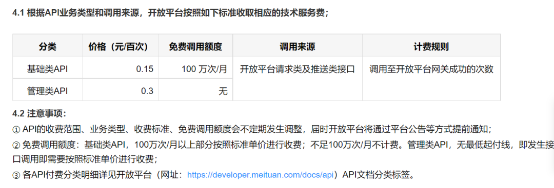 從美團開放平臺的官網(wǎng)得知,從2022年1月1日起對部分API接口調(diào)用進行收費,收費對象暫定對調(diào)用開放平臺 API(含請求、消息推送)的第三方開發(fā)者。