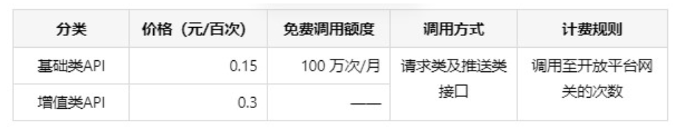 收費標準分為:基礎類API為 0.15 元/百次,免費調(diào)用額度100 萬次/月;管理類API為 0.3 元/百次,無免費調(diào)用額度。