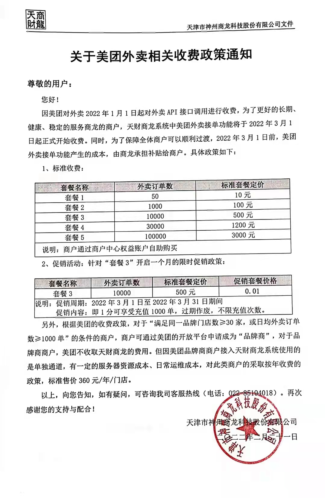 天財商龍出了一份更具體的收費細則通知,從3月1日起,商戶按套餐選擇外賣接單功能,按訂單數(shù)量收費,50筆訂單10元,折合0.2元/單;1000筆訂單100元,折合0.1元/單;10000筆訂單500元,折合0.05元/單……訂單越多收費越低。