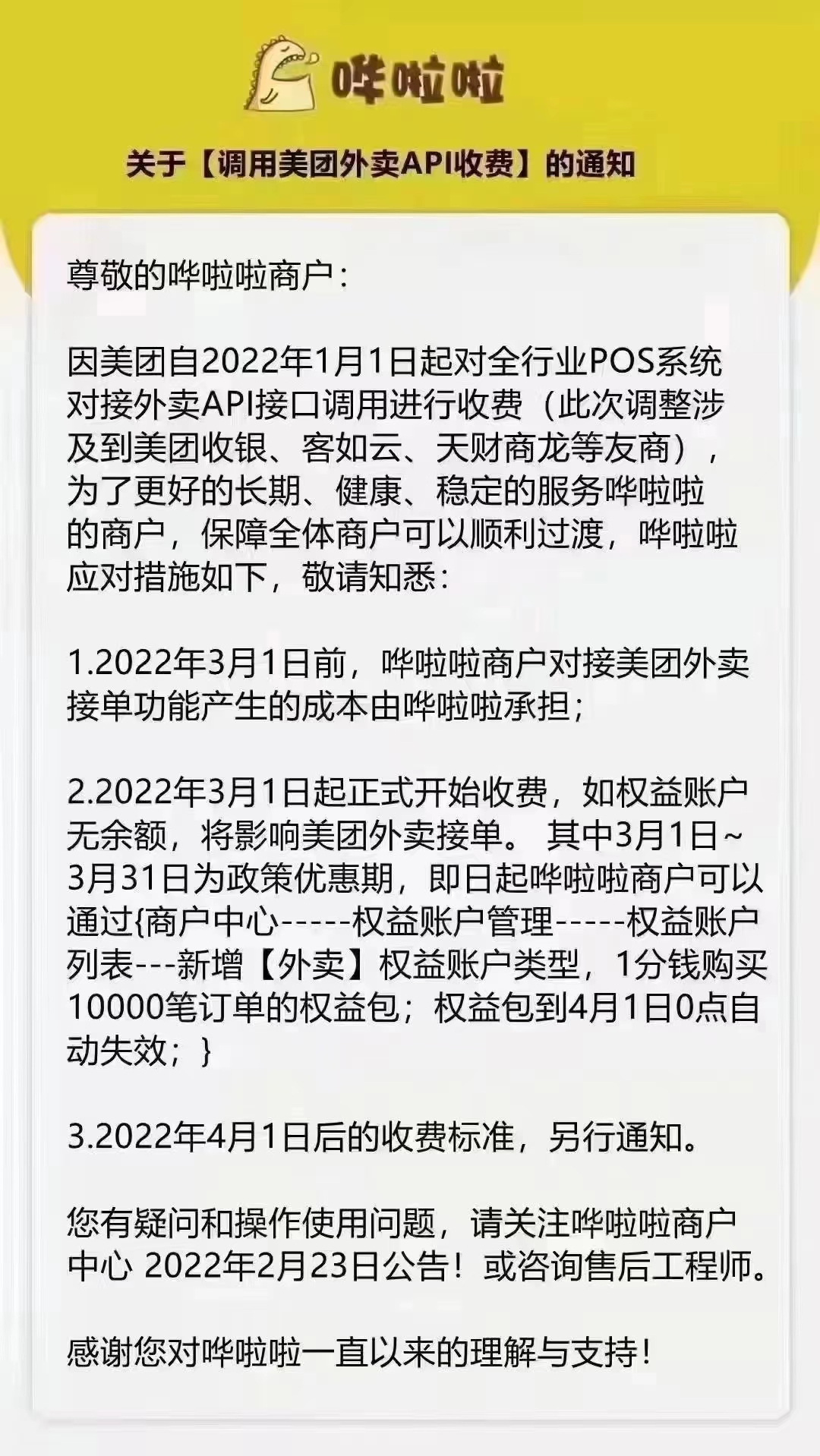 原來,幾乎所有的云打印機都對接了美團、餓了么等外賣平臺的接口,之前這個接口一直是沒有收費的,但今年美團餓了么相繼發(fā)布了收費的公告,美團從1月1日起已經(jīng)開始收費了,餓了么預計6月份也將跟著開始收費。