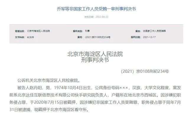 快手第一大反腐案落錘,原副總裁趙丹陽獲刑7年