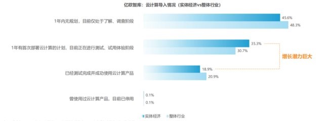 而根據(jù)億歐智庫發(fā)布的《2021中國企業(yè)上云指數(shù)洞察報(bào)告》,2021年實(shí)體經(jīng)濟(jì)企業(yè)中已經(jīng)完成云部署的滲透率為18.9%,而在一年之內(nèi)有上云計(jì)劃的企業(yè)占比35%,這中間有17%的增長空間。