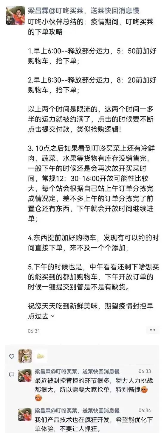 不得不說(shuō),“搶菜”也是一門技術(shù)活。除了運(yùn)氣的成分外,還得益于叮咚買菜創(chuàng)始人梁昌霖4月8日在朋友圈分享的下單攻略。依照著攻略,我提前定好鬧鐘,從搶不著到撿漏,再到順利買到“蔬菜保供盲盒”,不再像無(wú)頭蒼蠅般盲目搶菜,整個(gè)過(guò)程變得有章可循。