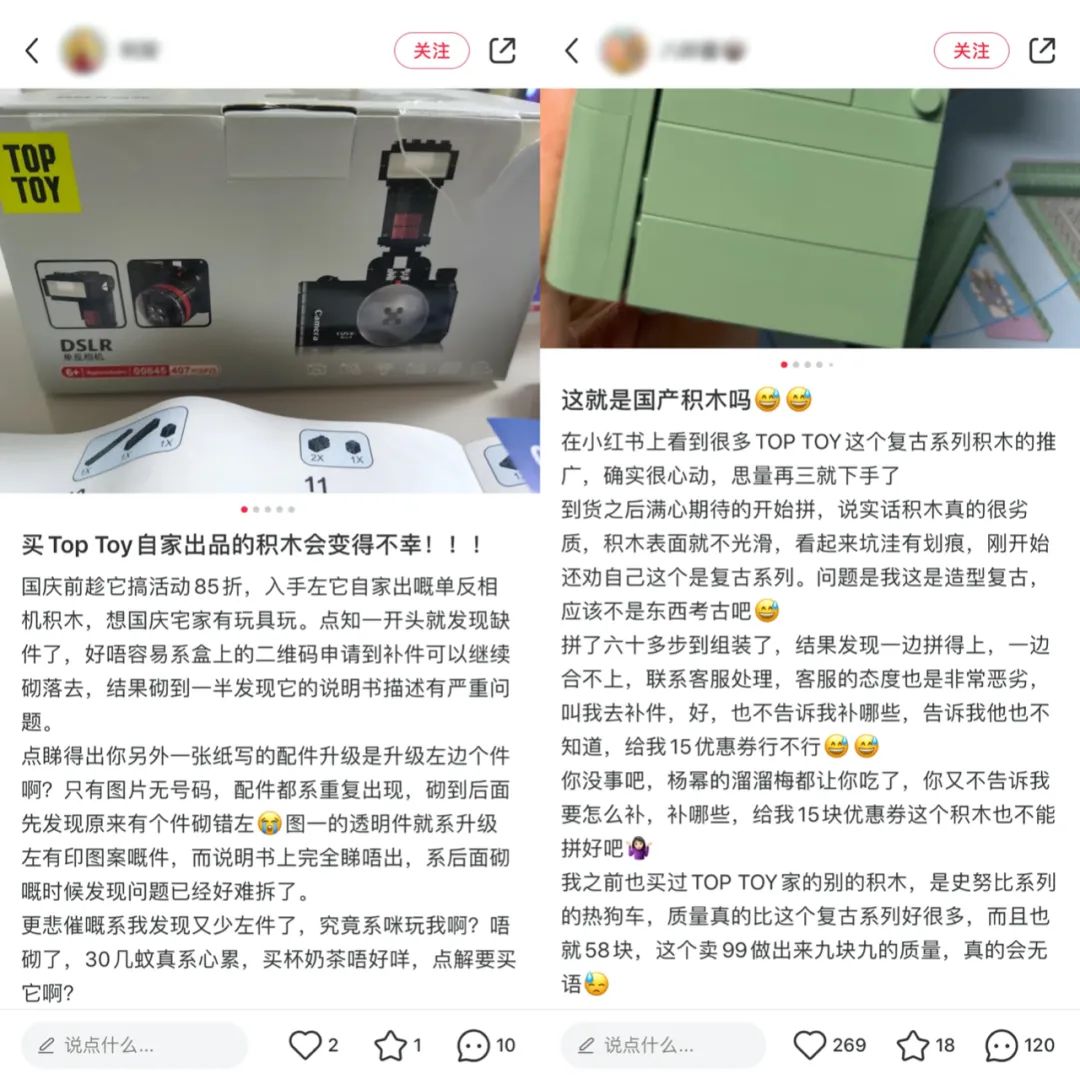 在小紅書上,有不少消費(fèi)者反映,TOP TOY的積木存在表面不光滑、貼合度不夠好、說明書存在錯(cuò)誤等質(zhì)量方面的問題。在產(chǎn)品風(fēng)格上,有資深積木玩家告訴「新熵」:“目前國產(chǎn)積木普遍走的是平價(jià)樂高路線,在產(chǎn)品系列、產(chǎn)品風(fēng)格上都會(huì)向樂高貼近。比如國產(chǎn)品牌LOZ的多款積木和樂高的積木高度雷同。”