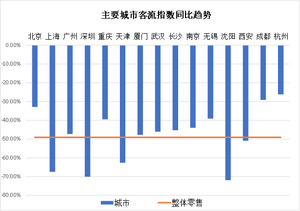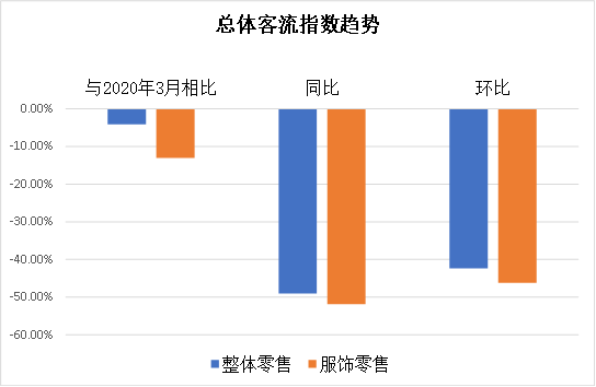 3月線(xiàn)下整體零售客流指數(shù)同比下降49.1%