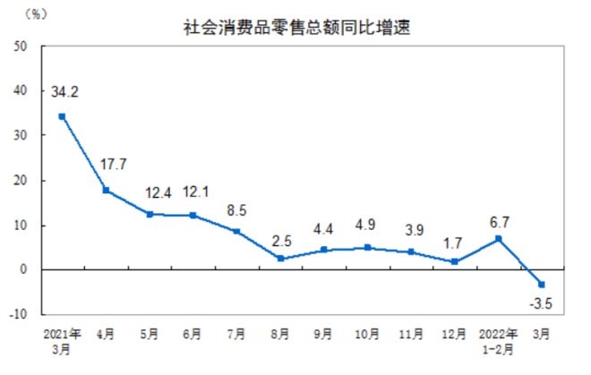 根據(jù)國(guó)家統(tǒng)計(jì)局的最新數(shù)據(jù)顯示,3月份社會(huì)消費(fèi)品零售總額34233億元,同比下降3.5%。其中,除汽車(chē)以外的消費(fèi)品零售額30560億元,下降3.0%。